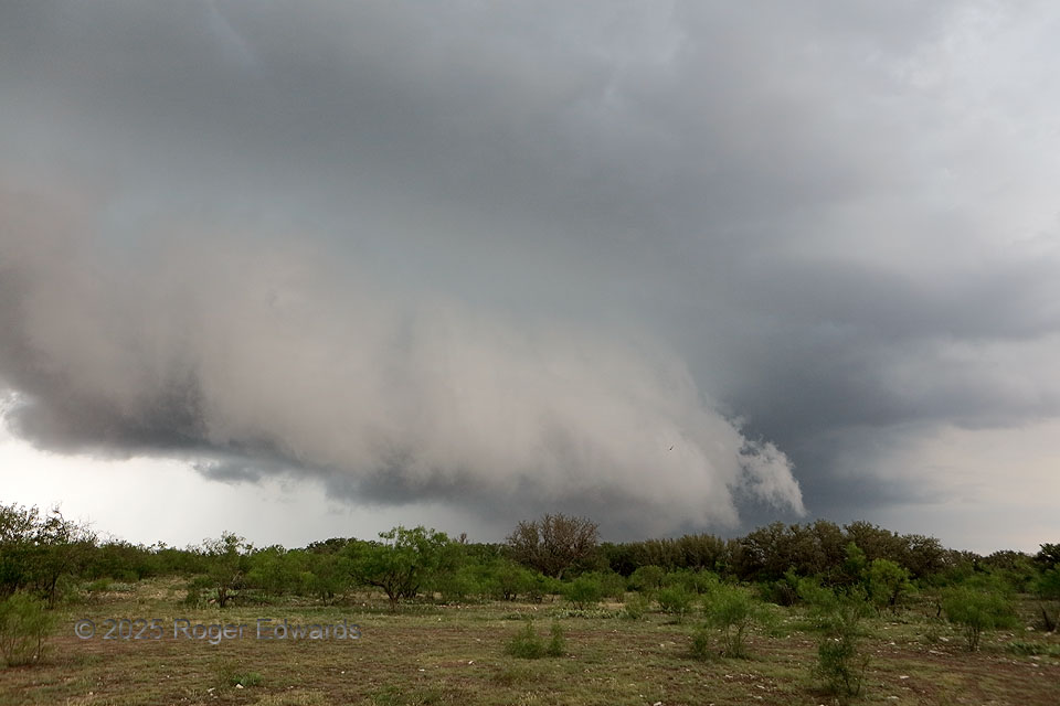 Hoping to get a closer look at a supercell that was traversing a large road void, we took a net northwesterly back road that “went through” to an eastern escape option on the maps, only to find it paved, then gravel, then dirt, then gated, chained and padlocked with a hand-painted DEAD END sign attached. Normally it’s a treacherous situation to be in front of a fast-moving, outflow-dominant supercell with only one way out, but at least the storm was on the flip side of that way out, and we knew that way was viable by having just been on it. During return, we stopped briefly in a rare relative clearing of the Edwards Plateau mesquite thicket, and admired this classic shelf with greenish tinge above, happy to have not gone further than that sign, then gotten caught by the hail core on a poor road. Sometimes being stymied is a blessing in disguise.
